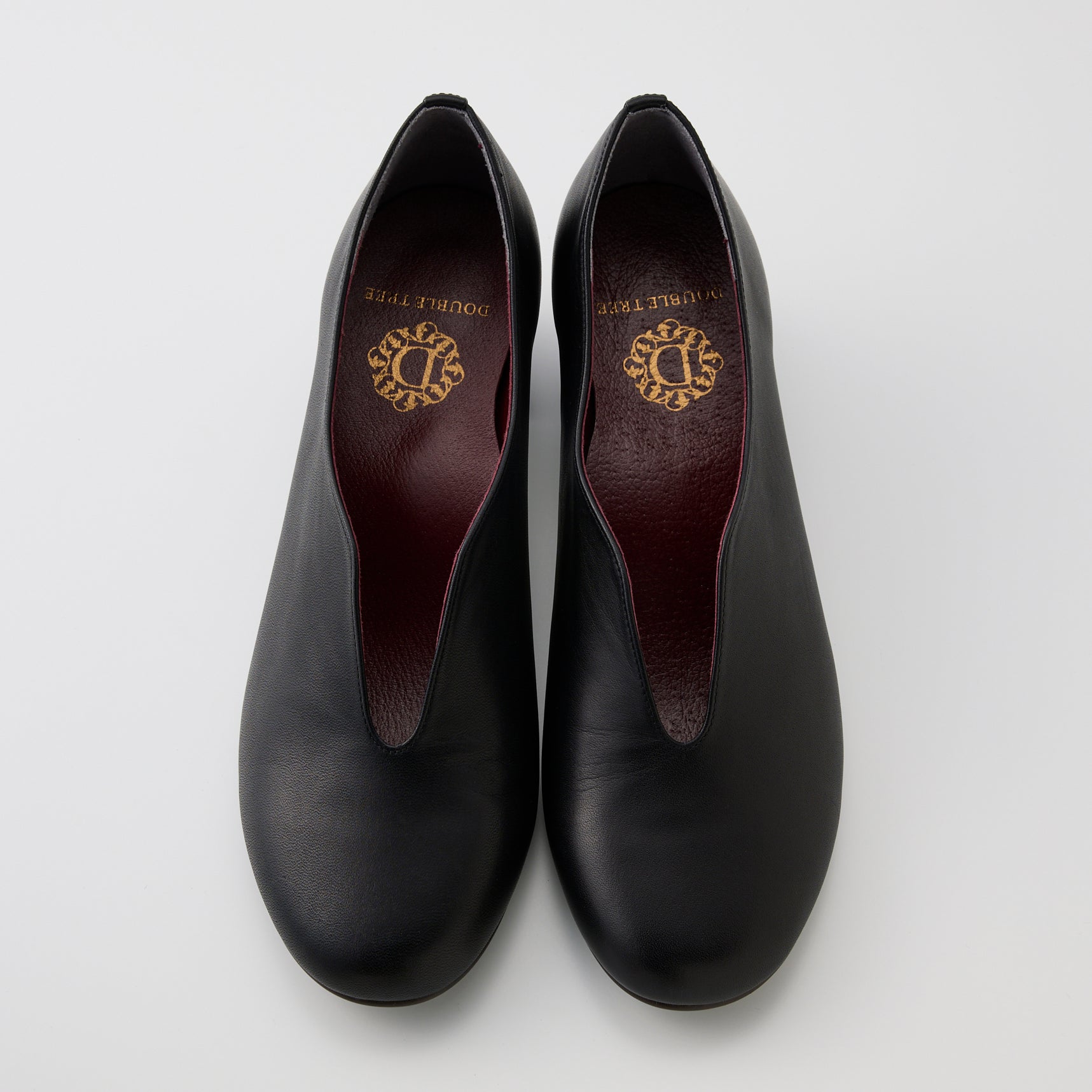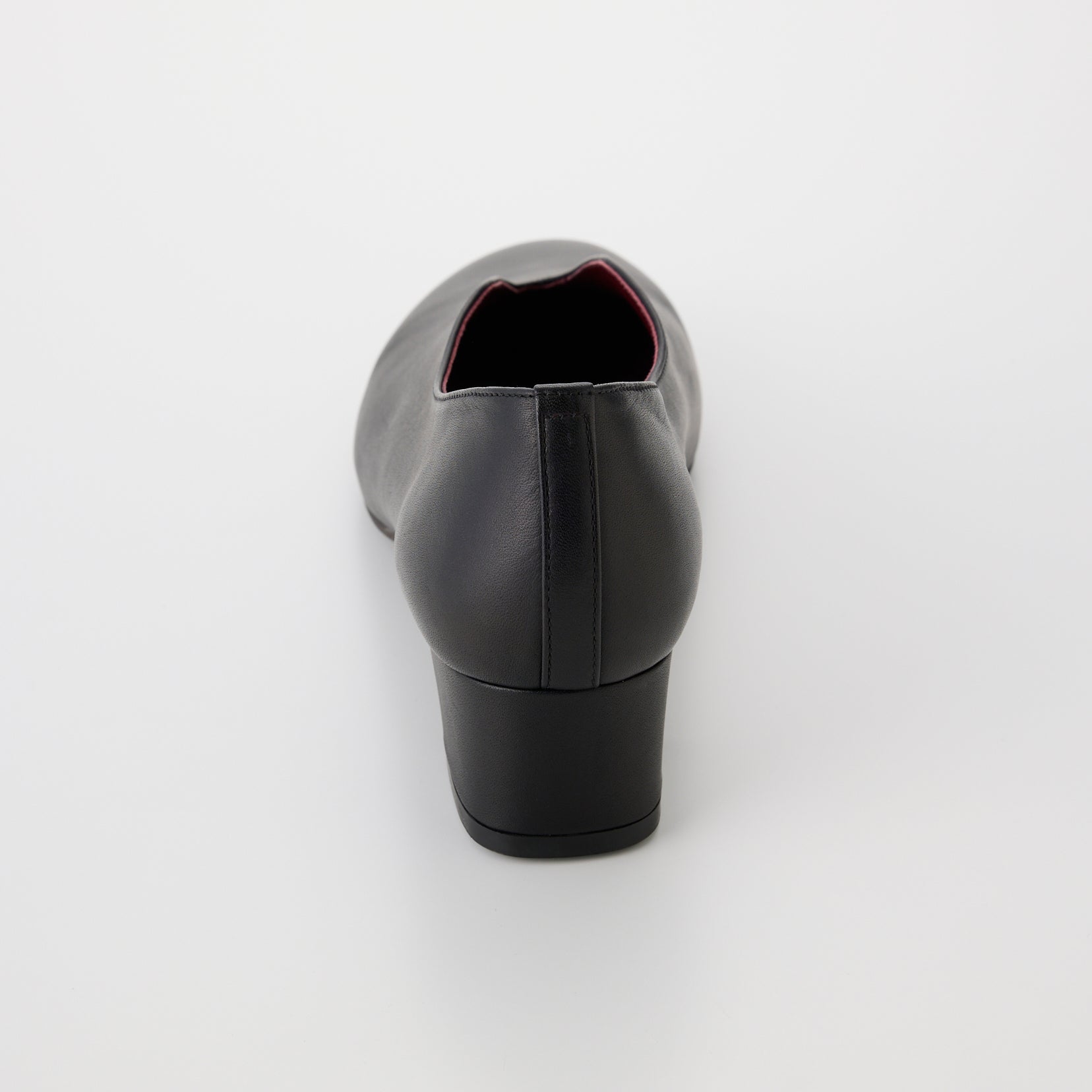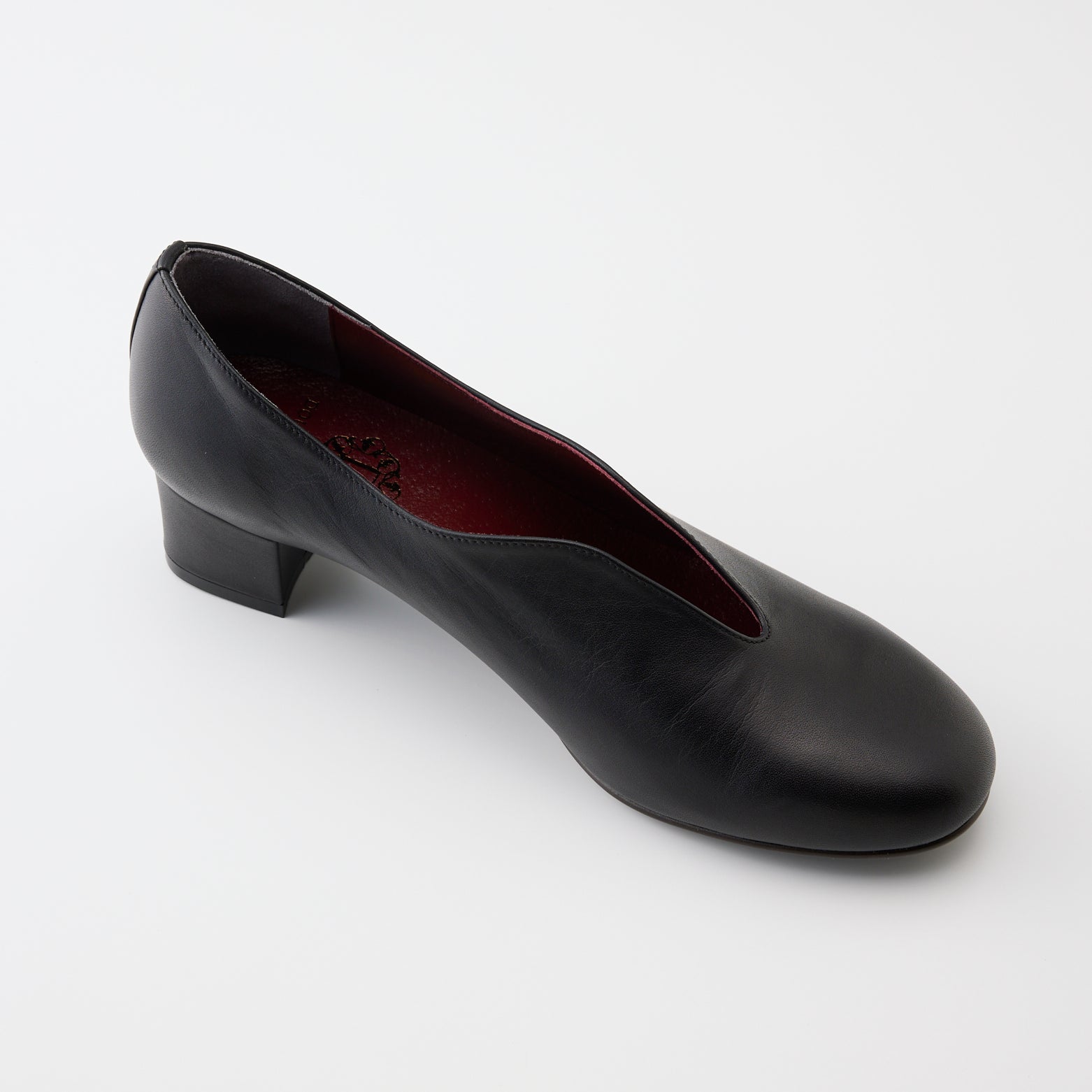 高級感あふれる防水加工牛革を使用したVカット太ヒールパンプス。ロングセラーモデルVALERIEのVカットの甲革に安定感のある太ヒールを組み合わせることで、洗練された雰囲気のフォルムを実現。足元をすっきりと美しく見せながら、履いた瞬間にその極上の履き心地を実感していただけます。